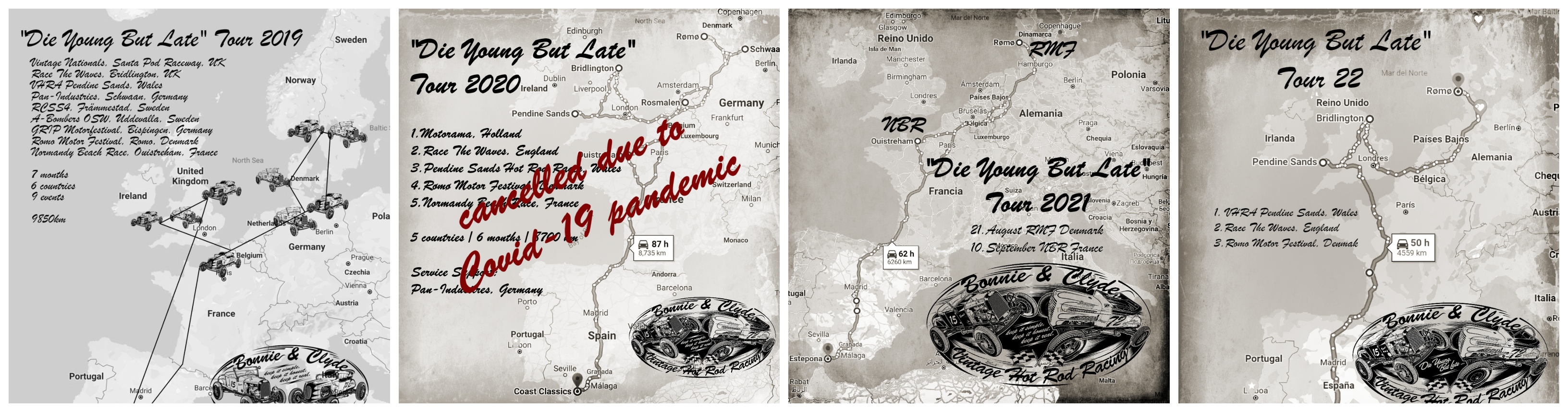 In the 2023 race season, Bonnie & Clyde Vintage Hot RodRacing completed their "Die Young But Late" tour, spanning fiveEuropean countries and covering 9400km. They showcased their skills at sevenexhilarating vintage race events across Europe, including the VHRA PendineSands Hot Rod Races in Wales, MPH Vintage Drags, VHRA GOW! at Prescott Hills inEngland, Kilomètre Lancé in Switzerland, Normandy Beach Race in France,Jochpass Oldtimer Memorial in Germany, and concluding with the Crossroad MotorFestival - 1/8-mile event in Andalusia, Spain.